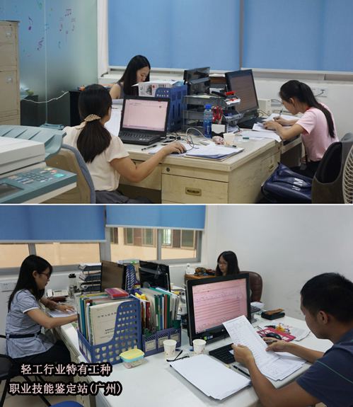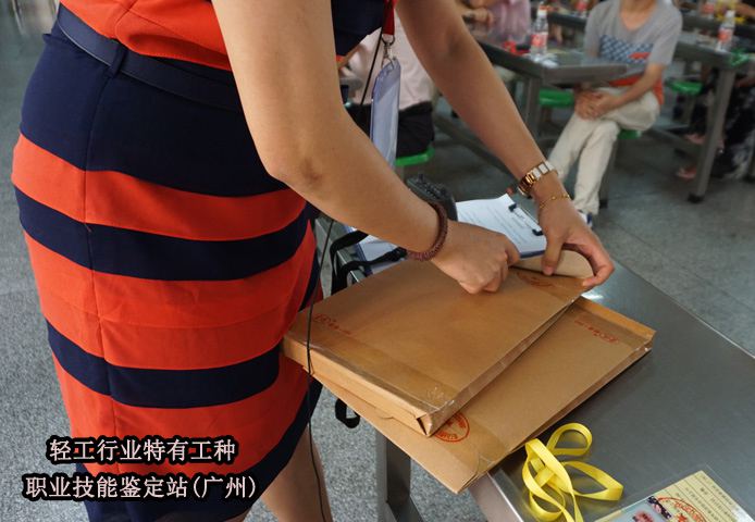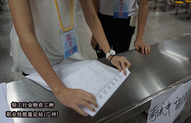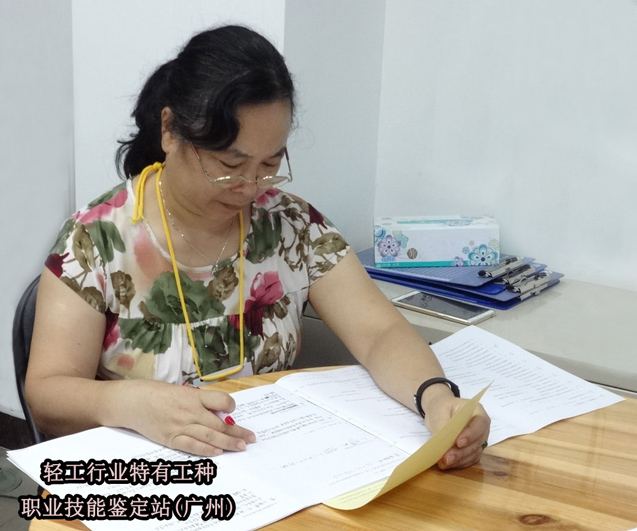 职业技能鉴定高级考评员潘绮珊老师正在认真批阅试卷。