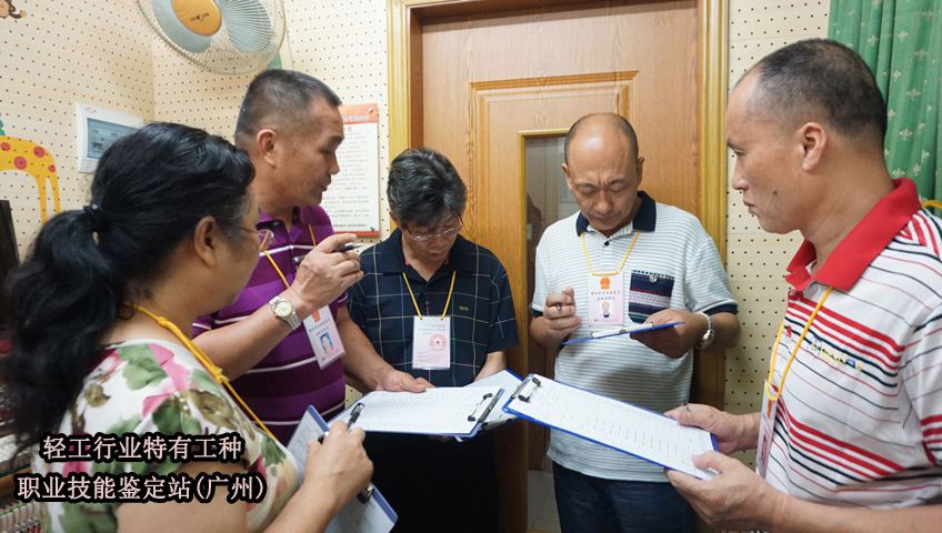 裁判组与轻工行业特有工种职业技能鉴定站(广州)站长龙洁勤(右一)合照。